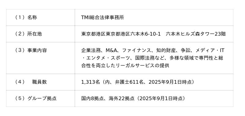 TMI総合法律事務所(東京都港区、代表:田中克郎)は、1990年に創立され、国内業務と渉外業務の双方の領域で豊富な経験を積んだ弁護士675名、弁理士101名(2025年9月1日時点)が在籍し、スタッフを含めると1,200名を超える日本最大級の法律事務所です。国内8か所、海外19か所に拠点(現地デスクを含む)を構えるグローバルファームとして、国内外で企業・団体・地域に密着したリーガルサービスを提供しています。法律事務所でありながら、自らベンチャーの設立や地方自治体とのデジタル化協定を締結するなど、創立以来、常に新しいチャレンジを続けてきました。今までにない新しい法律事務所や弁護士像・弁理士像を追求し、クライアントの幅広いニーズに対して即時にソリューションを提案できるチャレンジングな総合法律事務所を目指しています。