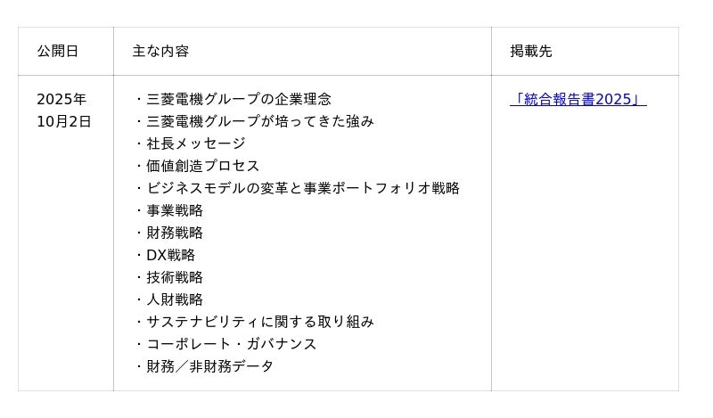 三菱電機株式会社は、株主・投資家をはじめとするすべてのステークホルダーの皆様に、当社グループの成長ストーリーを財務・非財務の両面から統合的にお伝えする「統合報告書2025」を、当社オフィシャルウェブサイトにて本日公開しました。