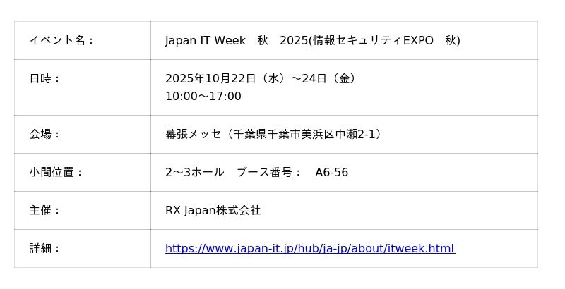 高千穂交易株式会社(本社:東京都新宿区、代表取締役社長:井出尊信、証券コード:2676、以下「当社」)は、2025年10月22日(水)~24日(金)に開催されるRX Japan株式会社主催のJapan IT Week 秋 2025内の 第15回「情報セキュリティ EXPO 秋」に出展することを発表します。当社は、進化するサイバー脅威に対し、実践的な対策と最新ソリューションを提供するランサムウェア対策プラットフォーム