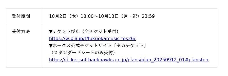 【福岡ソフトバンクホークス】第2弾LIVE ACT・出演日発表!1/24・25開催「FUKUOKA MUSIC FES.2026(福フェス)」