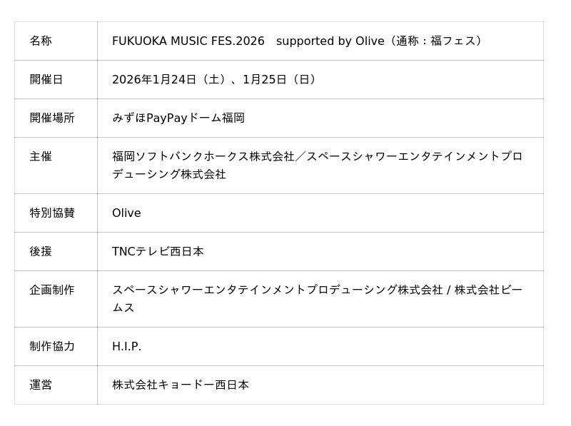 福岡ソフトバンクホークス株式会社は、スペースシャワーエンタテインメントプロデューシング株式会社およびセレクトショップ「BEAMS」を展開する株式会社ビームス(と共同でプロデュースする音楽フェス「FUKUOKA MUSIC FES.2026 supported by Olive(通称:福フェス)」の第2弾LIVE ACTとして7組の出演が決定し、第1弾LIVE ACTを含めた出演日が決定いたしましたので、お知らせします。