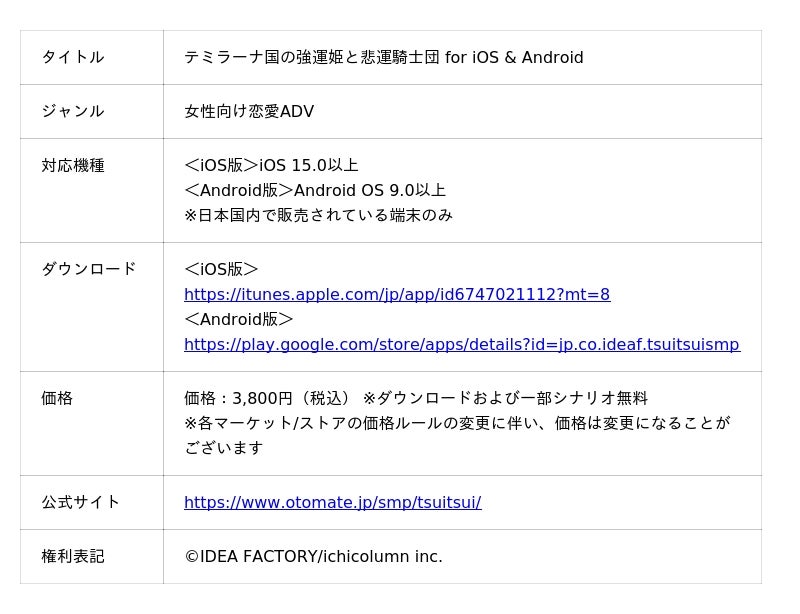 アイディアファクトリー株式会社が手掛ける女性向けゲームブランド「オトメイト」が贈る恋愛アドベンチャーゲーム『テミラーナ国の強運姫と悲運騎士団』が、スマートフォンアプリで登場!