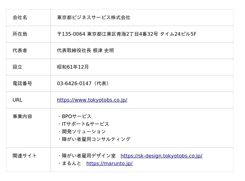この度、東京都が出資する第三セクター企業の東京都ビジネスサービス株式会社(本社:東京都江東区、代表取締役社長:根津 史明、以下「当社」)の100%出資子会社である『株式会社ティービーエスオペレーション』が運営する”しょうがい者就労支援センターコレンド”にて、2025年10月1日(水)から『就労選択支援サービス』(事業所番号:1310802606)の提供を開始いたします。