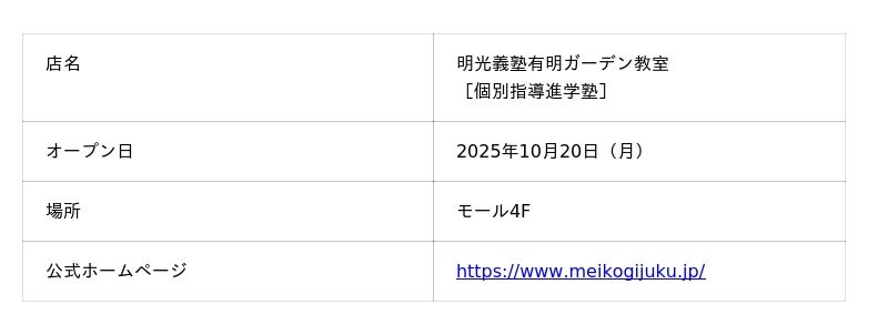 住友不動産商業マネジメント株式会社(本社:東京都新宿区 代表取締役社長:山本 直人)が運営する商業施設「住友不動産 ショッピングシティ 有明ガーデン」(所在:東京都江東区)に、新店舗『明光義塾』と『楽天モバイル』がオープンします。