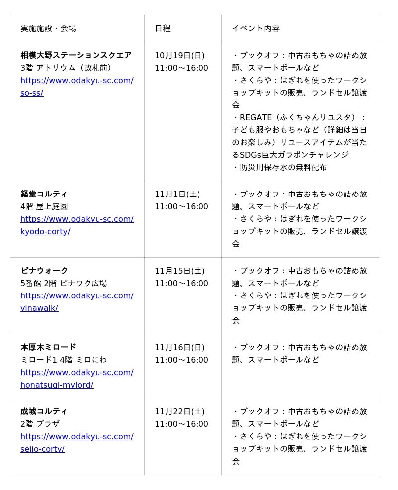実施施設:新宿西口ハルク、経堂コルティ、成城コルティ、新百合ヶ丘エルミロード、相模大野ステーションスクエア、ビナウォーク、本厚木ミロード、ODAKYU 湘南 GATE