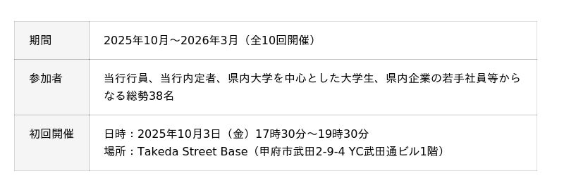 株式会社山梨中央銀行(頭取 古屋 賀章)は、2024年12月に立ち上げた甲府市中心街の活性化に向けたプロジェクトチーム「KOFUリバイブNext」の取組みとして、2035年をターゲットとした具体策を検討・発表する「KOFUリバイブNext 2nd Round-KOFU2035」を実施します。