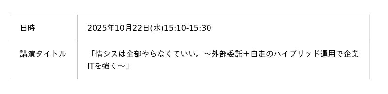 また、10月22日(水)には、オープンセミナーにも登壇し、企業の情報システム部門の業務支援につながる情報をご提供します。