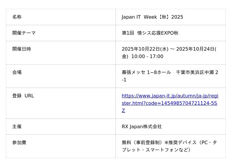 Japan IT Week 秋 2025 「情シス応援EXPO 秋」は、企業の情報システム部門が直面するリアルな課題に寄り添うソリューションが集結する展示会です。情報システム部門が行う業務は多岐にわたり、人材不足、働き方改革が叫ばれる中、「情シス業務を支えるサービスが見たい」という声に応え、25年10月秋展より新規開催されます。