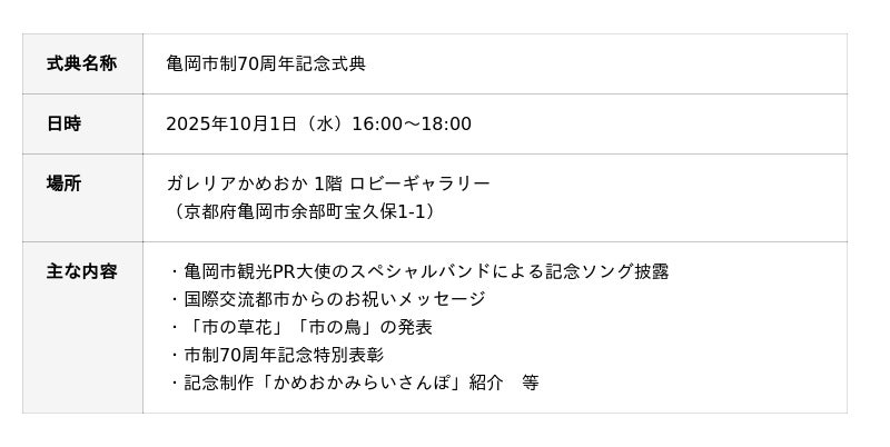 京都府亀岡市(市長:桂川孝裕)は、2025年10月1日(水)に市制施行70周年記念式典をガレリアかめおかで開催しました。ガレリアかめおかのロビーで開催され、「開かれた式典」として行われた本式典では、亀岡市観光PR大使である人気ロックバンド「くるり」の佐藤氏ら4名が一夜限りのスペシャルバンドを組み、市制70周年記念ソングを初披露しました。また、国際交流都市との絆を確認し、市の新たなシンボル、「市の草花」「市の鳥」を発表しました。長期的なビジョンとして、2050年を目指し、新たに歩みはじめます。
