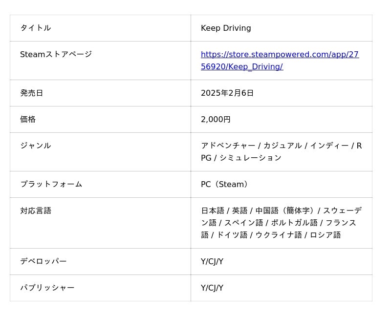 スウェーデン・ヨーテボリに拠点を多くインディーゲームスタジオ「Y/CJ/Y」が手掛ける、ピクセルアートが特徴的なロードトリップがテーマのオープンワールドドライブRPG『Keep Driving』が日本語やスウェーデン語、スペイン語など、複数の言語にも対応いたしました。また、2025年9月30日から開催中のSteamオータムセールでは20%オフとなる1600円で販売中です。
