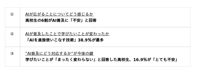 AIの普及に危機感を持つ高校生と、それを新たな学びや挑戦に繋げている高校生の間には差があり、この違いが今後のキャリアや進路選択に大きな影響を与える可能性がありそうです。今後は、高校生がAIを恐れることなく、主体的に活用できるような学習環境やサービスを整えていくことが重要だと考えられます。