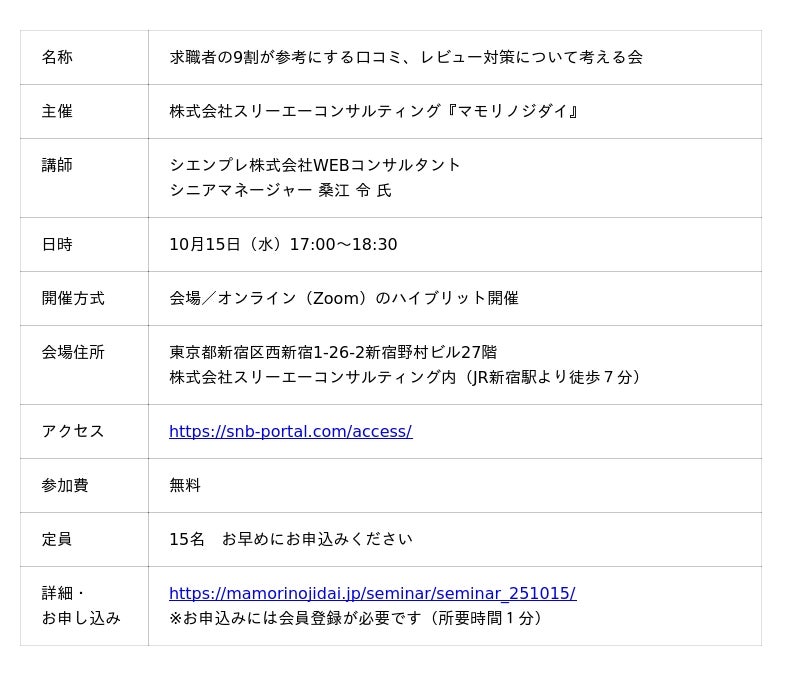 中小企業の守備力を強くするメディア『マモリノジダイ』を運営する株式会社スリーエーコンサルティング(代表取締役社長:竹嶋 寛人)は、2025年10月15日(水)17:00より、無料イベント「求職者の9割が参考にする口コミ、レビュー対策について考える会」を開催します。近年、ネット上の評判が売上や採用に与える影響は大きく、適切な対応を怠ると信頼を損ない、企業の信用失墜につながる可能性があります。本イベントでは、企業のネット炎上・誹謗中傷対策の専門家が登壇し、具体的な事例を交えながら、避けるべきNG対応や状況を好転させる実践的な対処法を解説します。信頼を守り、リスクを最小限に抑えるための具体的な解決策を学べる機会です。