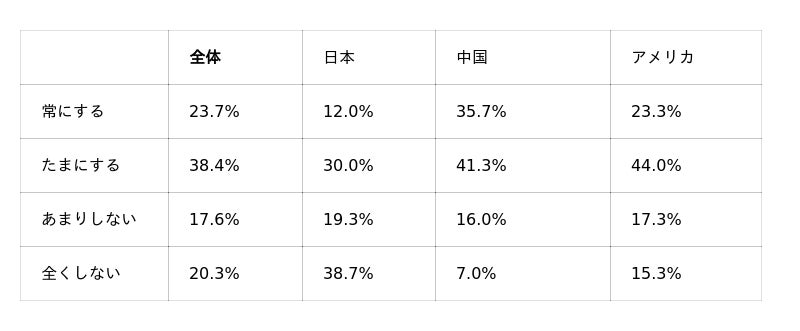 3カ国で比較すると、日本は 「常にする」と回答した人が最も少なく 、全くしない人が4割となりました。情報源としてSNSを参考にすることが多い中国・アメリカでは投稿も活発な傾向が見て取れます。