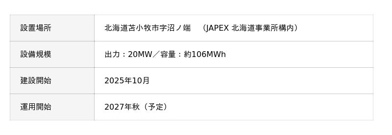 石油資源開発株式会社「JAPEX苫小牧蓄電所」の建設を開始