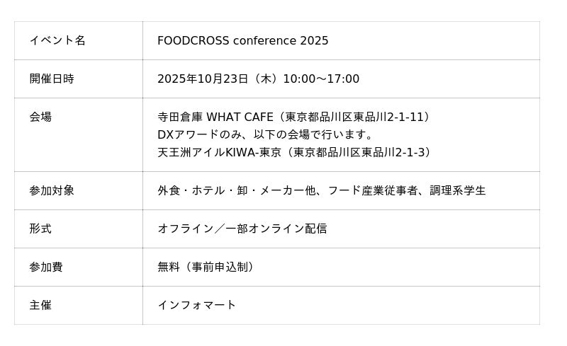 デジタルの力であらゆる業務を効率化する株式会社インフォマート(本社:東京都港区 代表取締役社長:中島 健、以下「当社」)は、10月23日(木)に、寺田倉庫 WHAT CAFE(東京都品川区東品川2-1-11)にて『FOODCROSS conference 2025』を開催します。