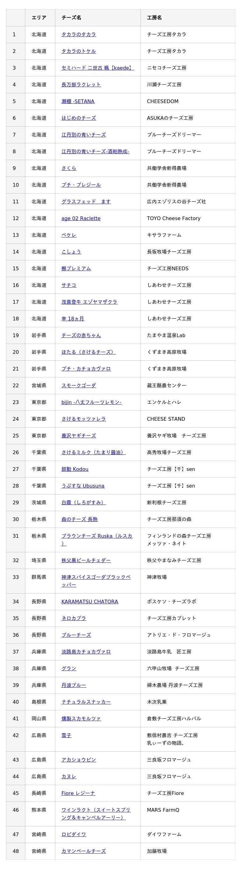 今年は、北海道から九州まで計17エリアから40工房48品が出品します。直近の国内チーズコンテスト2大会(Japan Cheese Awards、ALL JAPAN ナチュラルチーズコンテスト)の上位入賞チーズの中から希望者を募り、大会規定ほか条件をクリアしたものを選定しました。