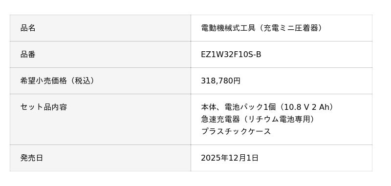 パナソニック株式会社 エレクトリックワークス社(以下、パナソニック)は、電動工具ブランド「EXENA(エグゼナ)」から「電動機械式工具(充電ミニ圧着器)」を2025年12月1日に発売します。