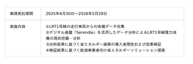 当社は今回、阪急電鉄から業務委託を受け本技術協力に参画し、デジタル基盤「Serendie(R)」の活用によるLRT1号線の電力消費の現状把握・分析および省エネルギー施策の導入実現性や効果の検証を行い、それに基づいた鉄道事業者向け省エネルギーソリューション提案を実施します。例えば、鉄道車両のブレーキ時に発生する回生エネルギーの余剰電力を見える化した地図上マッピングをもとに、車両の余剰回生電力を地上設備に融通する駅舎補助電源装置や、余剰回生電力を吸収して再利用する電力貯蔵装置の設置など、省エネルギー化に最適なソリューションを提案します。