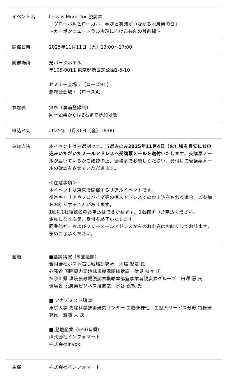 デジタルの力であらゆる業務を効率化する株式会社インフォマート(本社:東京都港区 代表取締役社長:中島 健、以下「当社」)は、デジタルが創る新しいエコノミーを考えるイベント『Less is More. for 脱炭素「グローバルとローカル、学びと実践がつながる脱炭素の日」~カーボンニュートラル実現に向けた共創の最前線~』(以下、「本イベント」)を、2025年11月11日(火)に芝パークホテルにて開催いたします。