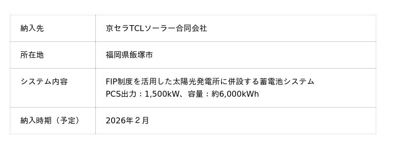 受注した設置工事は、京セラTCLソーラーが運営するFIT制度※2を活用した太陽光発電所をFIP制度に移行の上、蓄電池(容量約6,000kWh)を併設するものであります。本太陽光発電所は、テス・エンジニアリングが2018年に建設・納入したものであり、納入後もメンテナンスによる継続的なサービスを提供しております。