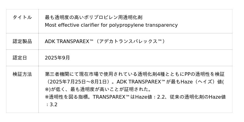 【ADEKA】世界最高の透明性で、ポリプロピレンの可能性を飛躍的に拡大!新規高性能透明化剤「トランスパレックス(TM)」がギネス世界記録(TM)に認定