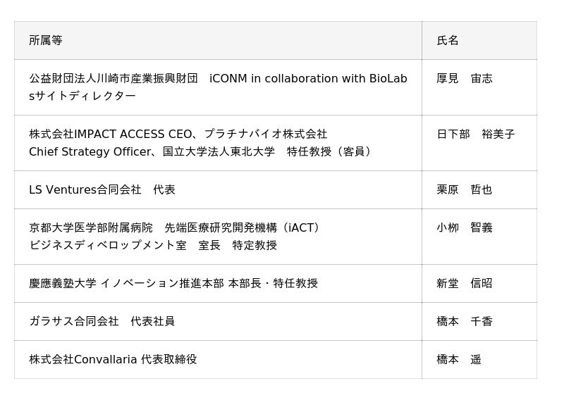 - VC等が有望な研究シーズを発掘し、事業化を目指すプロジェクトを公募します(下記2のとおり)。- 外部有識者等による審査を経て採択されたプロジェクトは、専門経営人材等を含む組織づくりを行い、創薬スタートアップの起業を目指します。- 都は、創薬分野におけるビジネス創出等に関し知見を有する有識者で組成されたアドバイザリーボード(下表)を設置します。- アドバイザリーボードは、採択されたプロジェクトの事業化や専門経営人材確保に関するサポート等、創薬エコシステムのネットワークと専門知識を活かし、継続的なハンズオン支援を行います。