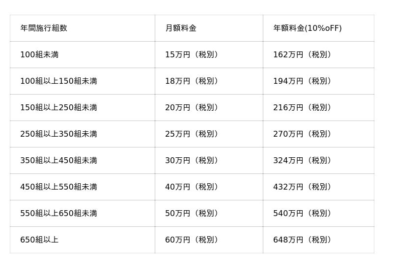 年間施行組数に応じた月額制を採用し、規模に応じて最適なプランを選択いただけます。