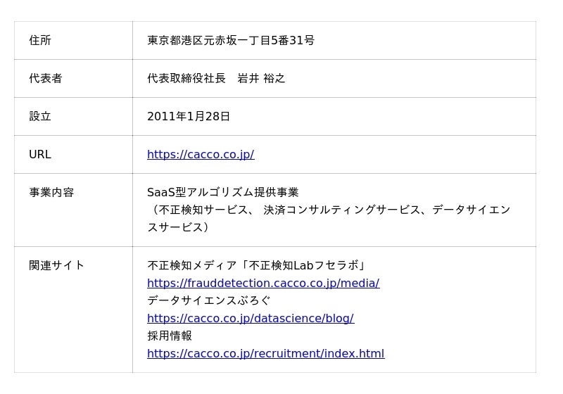 Caccoは、「未来のゲームチェンジャーの『まずやってみよう』をカタチに」という経営ビジョンを掲げ、セキュリティ・ペイメント・データサイエンス技術をもとに、アルゴリズム及びソフトウエアを開発・提供し企業の課題解決やチャレンジを支援することを目指しております。 オンライン取引における「不正検知サービス」を中核サービスとして位置づけ、不正ログインから不正注文対策まで対応可能な国内での導入実績数No.1の不正検知サービス「O-PLUX」や金融機関や会員サイトにおける情報漏洩対策の不正アクセス検知サービス「O-MOTION」、フィッシング対策サービス等を提供しております。