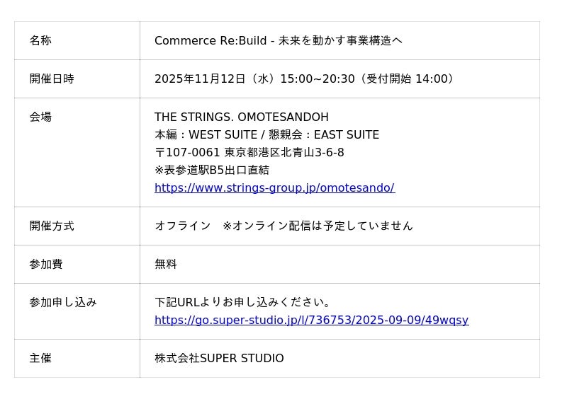 統合コマースプラットフォーム「ecforce」を提供する株式会社SUPER STUDIO(所在地:東京都目黒区、代表者:代表取締役社長 CEO 林 紘祐、以下:SUPER STUDIO)は、2025年11月12日(水)15時より、SUPER STUDIO初主催カンファレンス「Commerce Re:Build - 未来を動かす事業構造へ」をTHE STRINGS. OMOTESANDOHにて開催いたします。本カンファレンスは、コマース事業の構想と実行の間にある「構造の壁」を超え、未来に適応し続ける企業の"仕組み"を探っていくことをテーマに、変わり続けられる企業であるために必要な知見をお届けいたします。