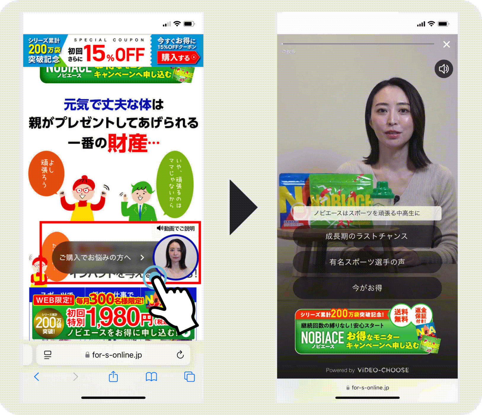 「VideoChoose」は、国内初※1の 動画版チャットボット であり、デジタルマーケティングに革新をもたらすソリューションです。これをウェブサイトや広告LPに設置することで、訪問者の関心を惹きつけ、情報を直感的かつ効果的に伝え、最適なアクションへと導きます。