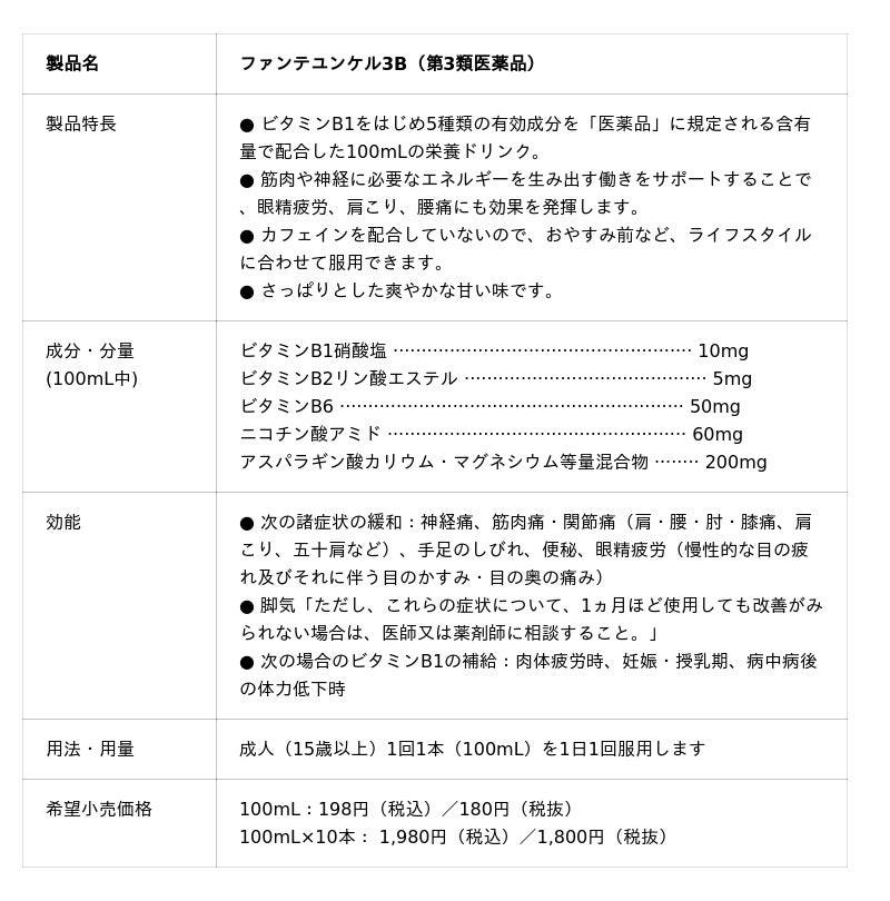 このたび、ファンテユンケルシリーズの1つである「ファンテユンケル3Bドリンク」の処方を新たに検討、有効成分を追加・増量し、「ファンテユンケル3B」としてリニューアルしました。今回のリニューアルでは、従来品に比べてビタミンB2、B6の配合量を増やし、新たにアスパラギン酸カリウム・マグネシウム等量混合物を追加したことで、「疲れ」や「肩・腰の痛み・目の疲れ」の悩みに、より幅広いニーズに対応できる設計となりました。