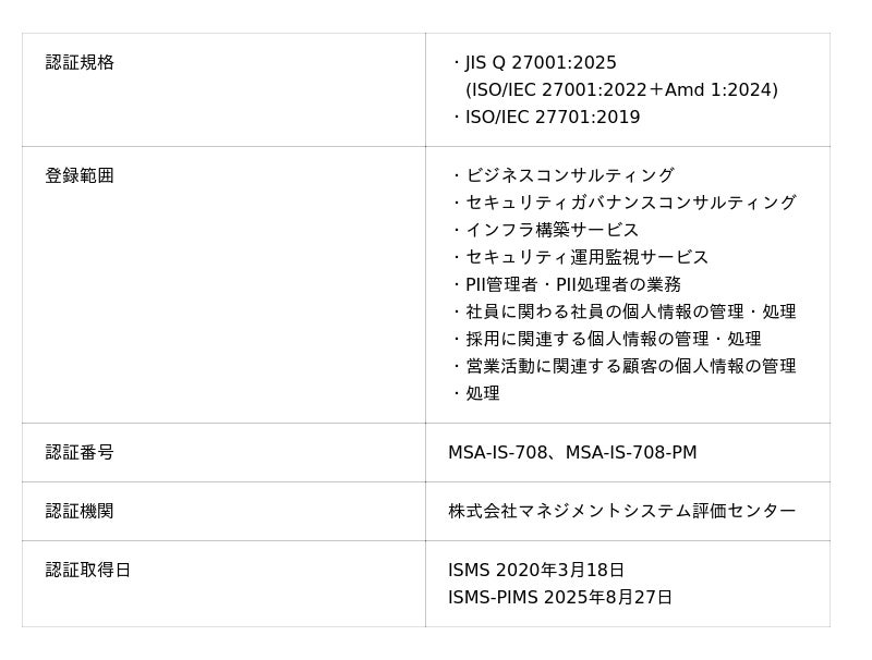 「セキュリティと利便性の両立」「リスクに強い組織づくりの伴走支援」を掲げる当社では、個人情報を取り扱うコンサルティングサービスを提供する企業として、お客様の信頼をさらに高めるため、ISMSに加えてISMS-PIMS認証の取得に至りました。