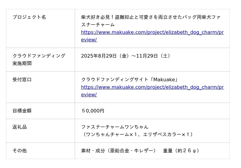 生活を便利にするグッズの商品化を行うふみえだ商店(本社:愛知県名古屋市、代表:國枝史子)は、バッグの防犯対策に役立つファスナーチャーム『エリザベスワンちゃん』の先行販売を、2025年8月29日(金)から11月29日(土)までの期間、クラウドファンディングサイト「Makuake」にて開始いたしました。昨年ご好評をいただいた「エリザベス猫ちゃん」に続く第2弾です。