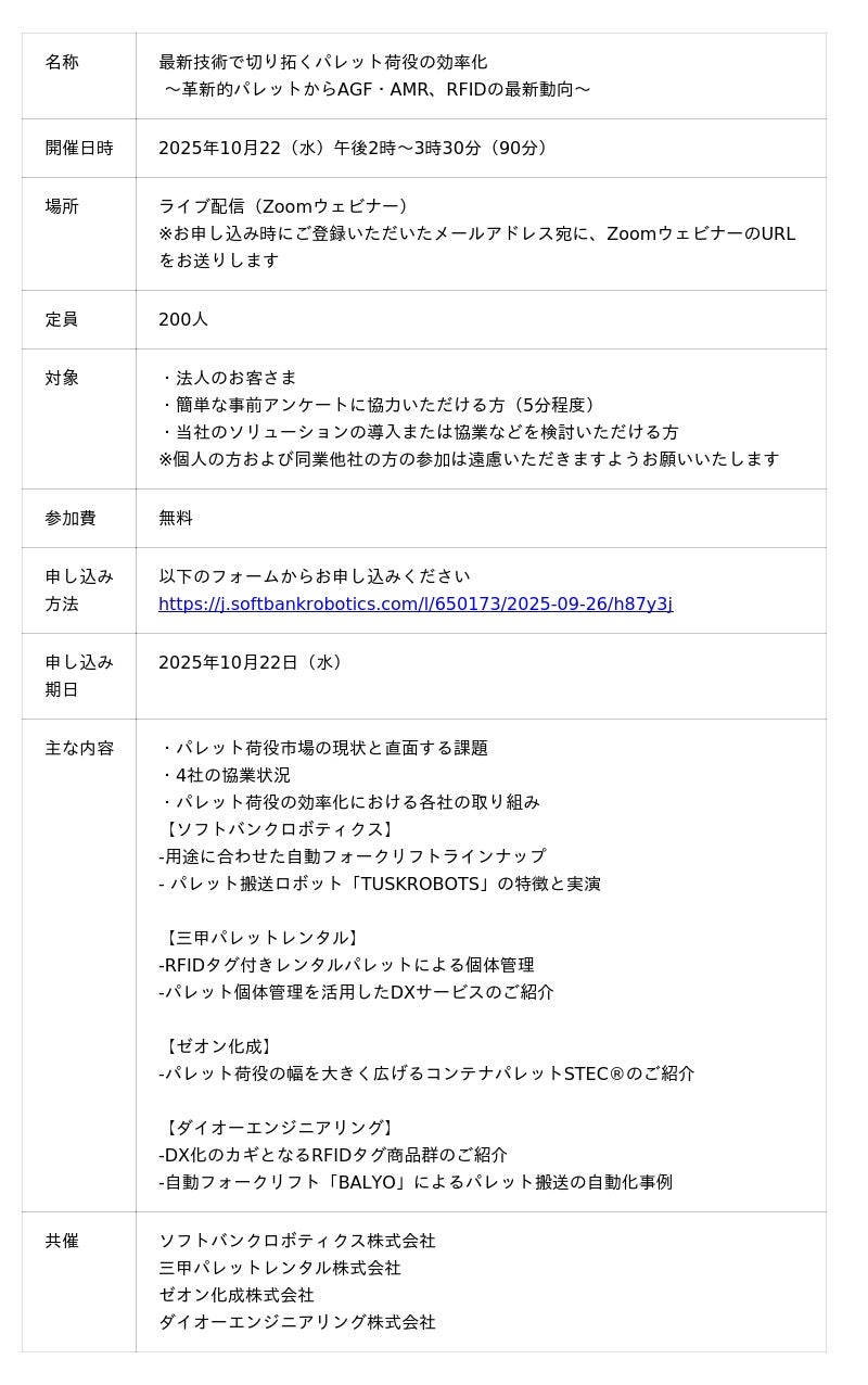 ソフトバンクロボティクス株式会社(本社:東京都港区、代表取締役社長 兼 CEO:冨澤 文秀)は、三甲パレットレンタル株式会社(本社:東京都港区、取締役社長:羽鳥 信)、ゼオン化成株式会社(本社:東京都千代田区、代表取締役社長:伊藤 敬)、ダイオーエンジニアリング株式会社(本社:愛媛県四国中央市、代表取締役社長:藤川 功裕)と法人向けオンラインセミナー「最新技術で切り拓くパレット荷役の効率化」を2025年10月22日(水)に開催します。