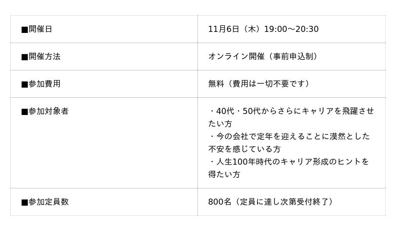 【11月6日開催】「人生100年時代のキャリア戦略~40代・50代の“次”のキャリアの選択肢~」 無料オンラインセミナー
