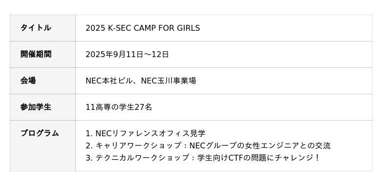 NECとKOSENサイバーセキュリティ教育推進センター(K-SEC)が共催する高専女子学生向け「2025 K-SEC CAMP FOR GIRLS」(9月11日、12日開催)にて、NECグループの女性エンジニアとのキャリアワークショップや学生向けCTF を体験するテクニカルワークショップを行いました。