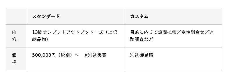 - キックオフ(約60分):狙う指標、ターゲット仮説、競合・代替の整理- 調査設計:10問テンプレを起点に、目的に応じて調査設問を設計- 回収:定義セグメント別にサンプル確保(規模は目的に応じて設計)- 分析:セグメント抽出/選択理由(顕在・潜在)/阻害要因の特定- 活用提案:顧客像に基づく施策提案