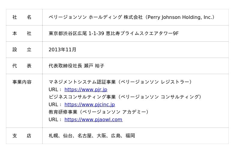 1994 年に設立されたマネジメントシステムの第三者認証機関 Perry Johnson Registrars, Inc.(本社:米国ミシガン州)の日本法人として、ISO 9001(品質)、ISO 14001(環境)、ISO/IEC 27001(情報セキュリティ)、 ISO 22000(食品安全)、FSSC 22000(食品安全)、ISO 45001(労働安全衛生)など、さまざまな規格の認証審査を行っています。2013 年 11 月にペリージョンソン ホールディング株式会社を発足しました。