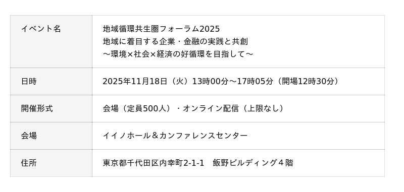 参加費無料|11月18日(火)13時~開催、環境省主催「地域循環共生圏フォーラム2025」の登壇者が決定!地域×企業・金融機関により環境・社会・経済の課題解決の好循環を目指します。