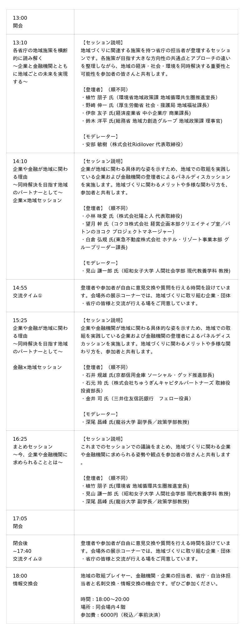 各省庁の政策担当者や、地域と関わる大手企業・大手金融機関・大学のキーパーソンが一同に会するフォーラムを開催。会場参加者限定で、登壇者・参加者同士の交流の場も提供。