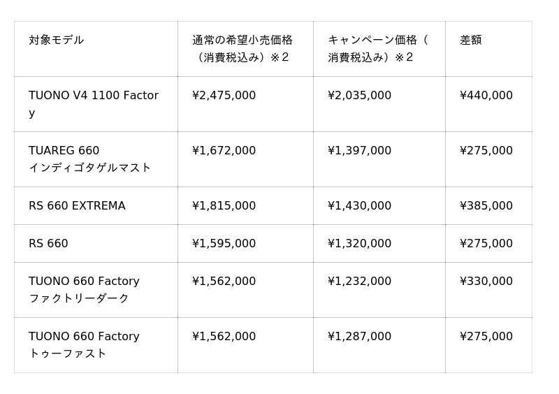 キャンペーン内容 / 正規販売店にて対象モデルの新車をご成約された場合、モデルに応じた特別価格にて購入いただけます。