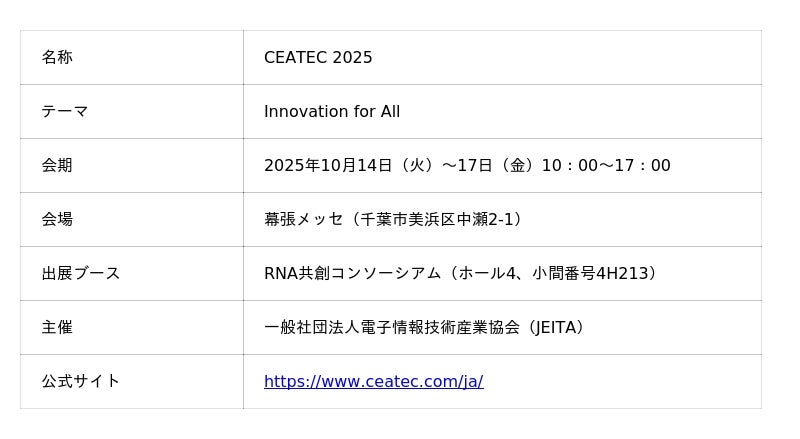 花王株式会社(社長・長谷部佳宏)は、株式会社アイスタイル(社長・遠藤宗)、キリンホールディングス株式会社(社長・南方健志)とともに、2025年10月14日(火)~17日(金)に幕張メッセで開催される、世界中の最先端テクノロジーが集まる展示会「CEATEC 2025」に「RNA共創コンソーシアム」*1として出展します。「RNA-Tech Driven Society ~RNAテックで変わる暮らしの8の新基準~」をテーマに、RNAによって今の自分の肌や身体の状態を知り、さまざまな場面で利活用する現在の取り組みと未来の姿を提案します。