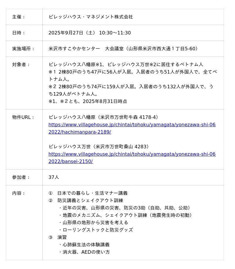 ビレッジハウス・マネジメント株式会社(本社:東京都港区、代表取締役社長兼CEO:岩元 龍彦、以下ビレッジハウス)は、山形県米沢市にある「ビレッジハウス八幡原」及び「ビレッジハウス万世」に居住するベトナム人を対象に、日本での安心安全な暮らしをサポートすることを目的とした「防災意識を高め安心安全な暮らしを!ベトナム人入居者対象の防災イベント」を2025年9月27日(土)に米沢市すこやかセンターで行いました。