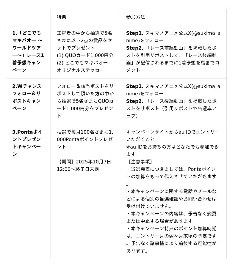 アニメ内のレースの1着予想に正解するとQUOカードが抽選で当たるプレゼントキャンペーンとPontaポイントが当たるプレゼントキャンペーンを実施します。