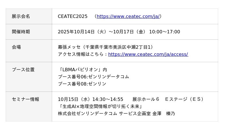 株式会社ゼンリン(本社:福岡県北九州市、代表取締役社長:竹川 道郎、以下「ゼンリン」)と、株式会社ゼンリンデータコム(本社:東京都港区芝浦、代表取締役社長:清水 辰彦、以下「ゼンリンデータコム」)は、2025年10月14日(火)~10月17日(金)の期間、幕張メッセにて開催されるデジタルイノベーションの総合展「CEATEC 2025」において、ゼンリングループが保有する地理空間情報や生成AIを活用した複数のデモサービスを出展します。なお、本展示は一般社団法人LBMA Japan(※)が運営する「LBMAパビリオン」内での出展となります。