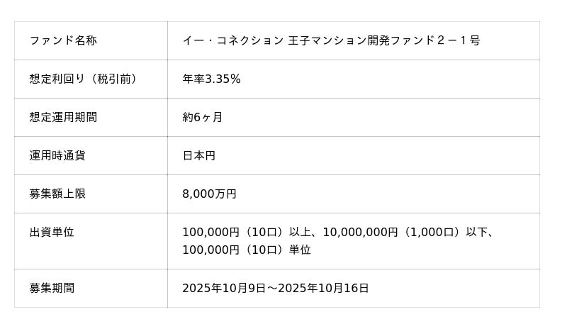 貸付型クラウドファンディング「Funvest」10/9より新ファンド「イー・コネクション 王子マンション開発ファンド2-1号」の募集開始