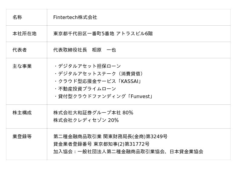 Fintertechは、大和証券グループ及びクレディセゾンがそれぞれ創業来培ってきた金融ビジネスのノウハウを礎としながら、最先端のテクノロジーの活用や外部企業との連携により次世代金融サービスを機動的にかつ柔軟に創出することを目指しています。 主な事業として、暗号資産を活用した「デジタルアセット担保ローン」及び「デジタルアセットステーク(消費貸借)」、クラウド型応援金サービスの「KASSAI」、「未来をわかちあう投資」を提供する貸付型クラウドファンディングサービス「Funvest(ファンベスト)」を展開しています。
