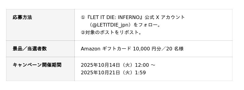 体験版「LET IT DIE: INFERNO DEMO」の配信を記念し、 公式 X アカウントでキャンペーンを実施します。抽選で20名様にAmazonギフトカード10,000円分が当たります。