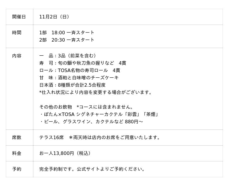 *タイアップ営業は全て「TOSA -Riverside Sushi Bar-」にて開催されます。本件に関するお問い合わせは当店までお問い合わせください。