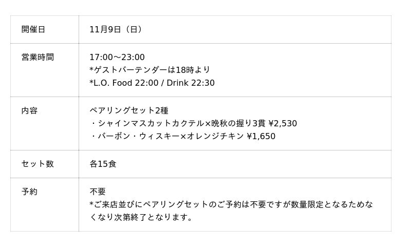 2025年10月に2周年を迎える「BAR SHIMIZU ~small talk~」よりオーナーである清水氏をTOSAに1日限定のゲストバーテンダーとして迎えます。TOSAでもバーテンダーとして在籍していた清水氏のカムバック営業となり、BAR SHIMIZUの人気カクテルとTOSAの人気メニューをお得に楽しめるペアリングセットを数量限定でご用意します。